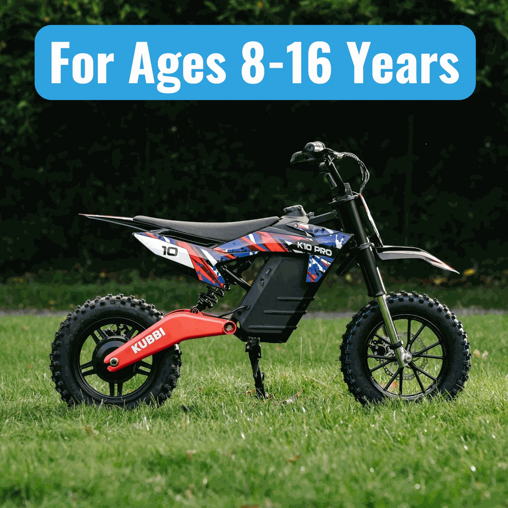The Kubbi K10 Pro packs a powerful 800W motor, advanced dual suspension, and large 14” off-road tires to deliver a smooth, stable ride on tough terrain. With three speed settings up to 30 km/h and support for riders up to 90 kg, it’s built for bigger kids seeking serious adventure and comfort. Recommended for children aged 8–16 years with a height between 120–170 cm. The seat height (from ground) of 72 cm gives confident riders good balance while maintaining agility. The bike length of 137 cm, handlebar height of 87 cm, and handlebar width of 72 cm ensure a comfortable riding position for growing riders